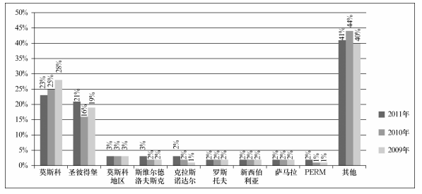 俄羅斯境內(nèi)有300多家公司從事安防產(chǎn)品的銷售和服務(wù),但由于區(qū)域消費水平和安防產(chǎn)品需求量的不同,至少超過55%的安防公司和用戶集中分布在莫斯科和圣彼得堡境內(nèi),其他地區(qū)合起來僅占45%,具體分布情況如下圖: