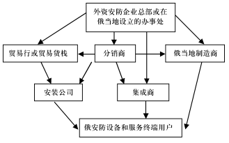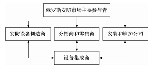 除此之外,地產(chǎn)公司、各大銀行、零售店、能源企業(yè)(石油和天然氣)等實體機(jī)構(gòu)同樣作為安防產(chǎn)品的購買商和終端用戶,他們的購買力也不容忽視,總需求量占俄整個安防市場的50%以上。在上文的俄羅斯安防市場背景中已經(jīng)提到,俄安防企業(yè)主要為分銷商和系統(tǒng)集成商,同時還包括少量產(chǎn)品制造商、解決方案供應(yīng)商、安防產(chǎn)品零售商和安防設(shè)備安裝和服務(wù)公司,共同組成了俄羅斯安防市場的參與者,基本結(jié)構(gòu)圖如下: