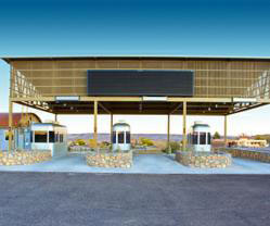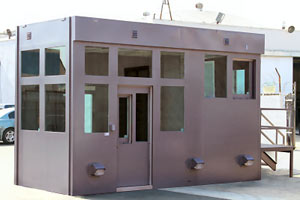 美國BIGEnterprises,Inc公司新開發(fā)了一種雙層的、可應(yīng)對(duì)極端天氣情況的崗?fù),主要用于邊境檢查站。該崗?fù)け痪薮蟮膰鷫Νh(huán)繞,在極端天氣情況下檢查過往的卡車或是其他交通工具。警衛(wèi)站在崗?fù)?nèi),可以直接通過目光檢查地面上通過的車輛,而不需要走到崗?fù)ね饷嫒ァT撛O(shè)施具有很強(qiáng)的防彈性能,并配置了多種供電設(shè)施以支持報(bào)警、攝像監(jiān)控和其他通信功能。崗?fù)ろ敳垦b有空調(diào)系統(tǒng),同時(shí)輔助有備用加熱和地板加熱裝置。