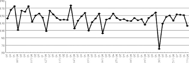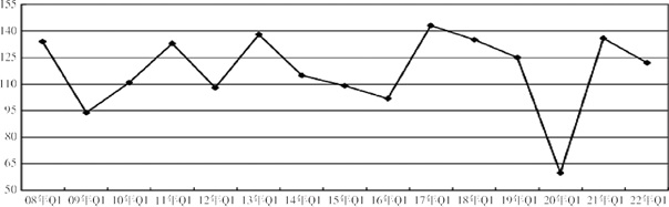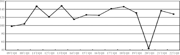 2022年一季度,外贸出口景气指数为100,比上季度下降了3个百分点,与去年同期持平,位于"微景气区间"(见图7)。其中,有27%的调查企业国外订单有了新的增长,比上季度下降了2个百分点;有46%的企业反映销售"持平",比上季度上升了1个百分点;有27%的企业反映"下降",比上季度上升了1个百分点。