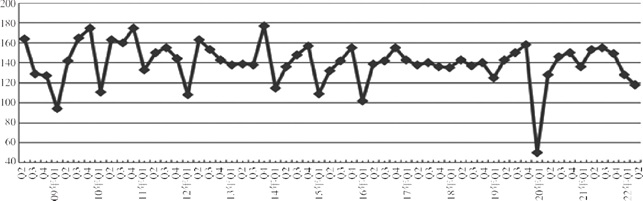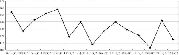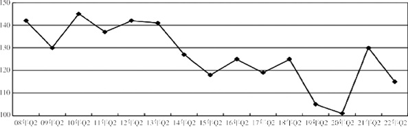 2022年二季度,安防行业生产(施工)景气指数为122,比上季度下降了6个百分点,与去年同期相比下降44个百分点,位于"较景气区间"(见图13)。在调查对象中,有46%的企业反映生产(施工)规模比上季度扩大,有29%的企业反映与上季度持平;有24%的企业反映生产(施工)规模减小。
